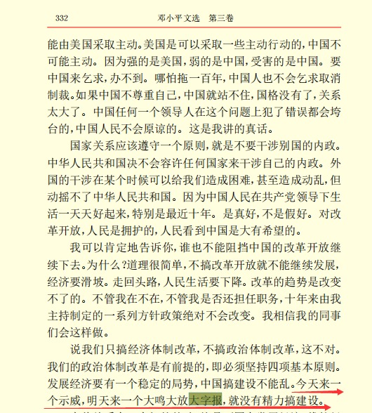 “说我们只搞经济体制改革,不搞政治体制改革,这不对。我们的政治体制改革是有前提的,即必须坚持四项基本原则。发展经济要有一个稳定的局势,中国搞建设不能乱。今天来一个示威,明天来一个大鸣大放大字报,就没有精力搞建设。”