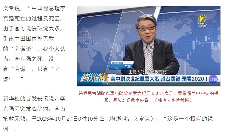 范畴的文章最后说,“现在评论李克强之死为阴谋者,要当心了,这是阳谋,不是阴谋。”