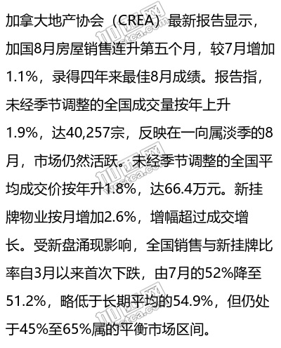 加国8月房屋销售连升五个月 加拿大地产协会(CREA)最新报告显示,加国8月房屋销售连升第五个月