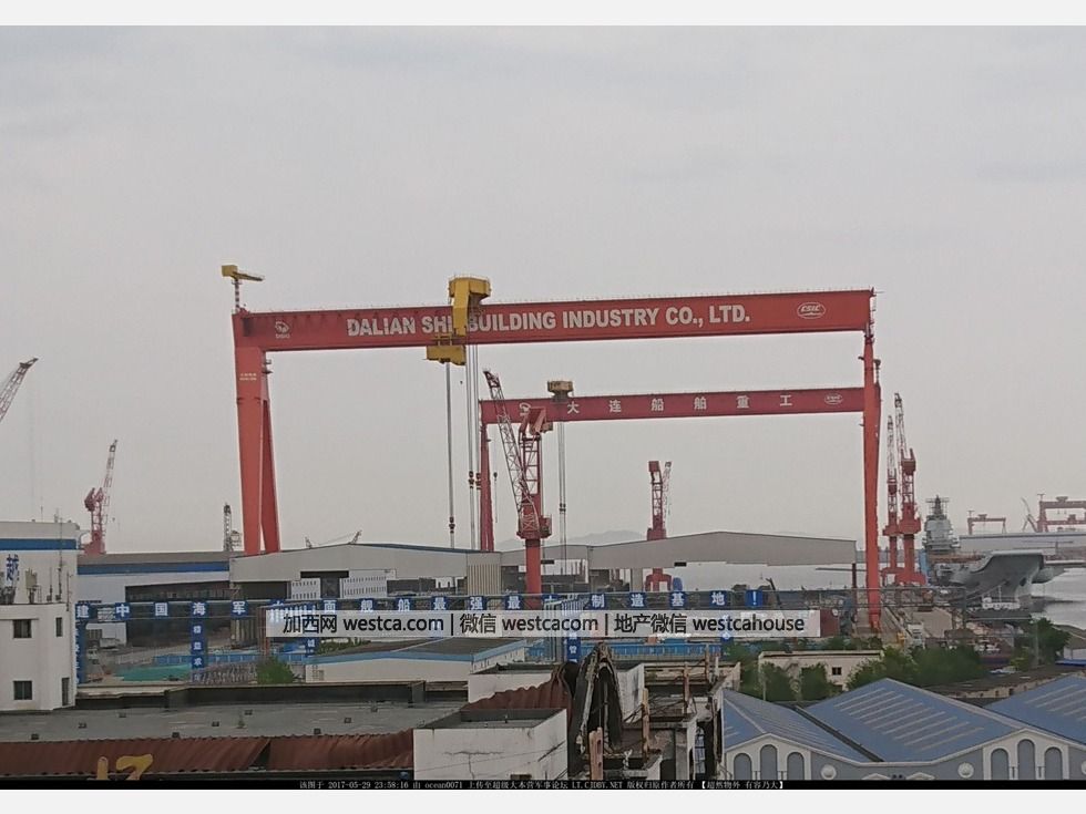 大连造船厂内部实景照,可见在一旁码头驻泊的解放军001A航母。(图源:超级大本营军事论坛)