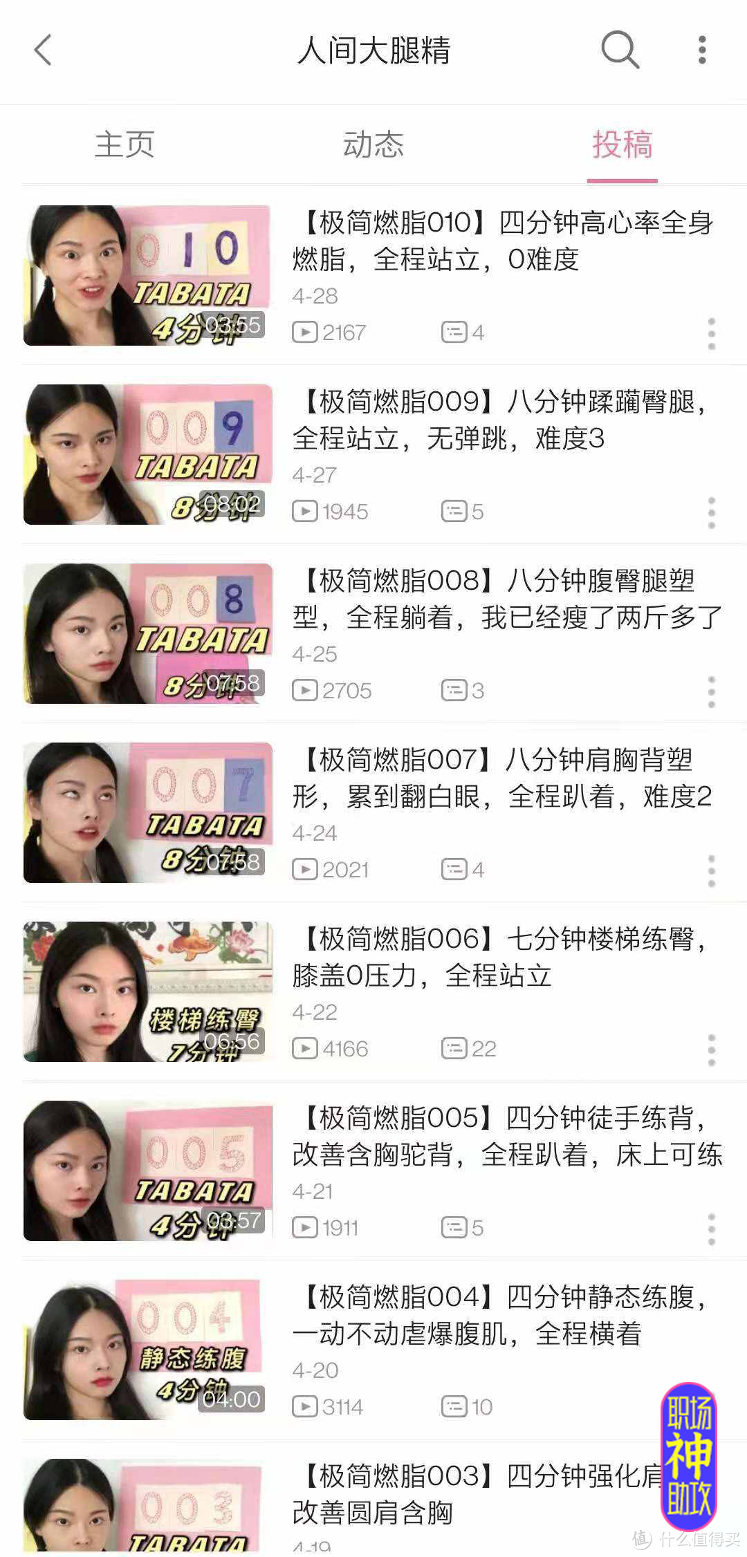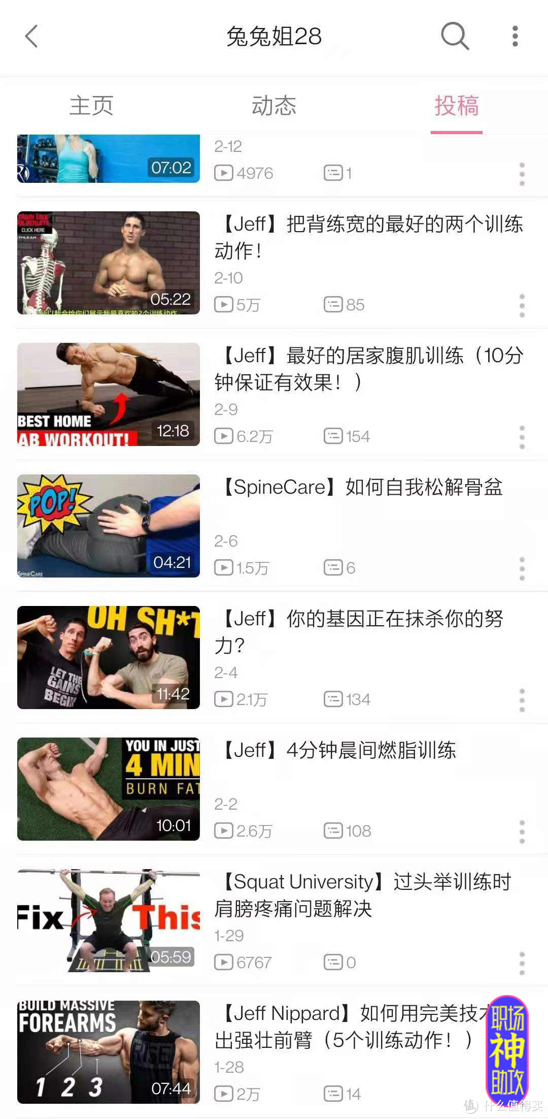 与猫叔不同,他的健身视频主要关于局部瘦身的,也有不少关于体态矫正的。