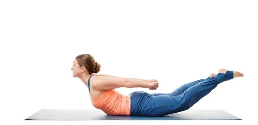俯卧,双腿打开与髋同宽。在呼气的同时抬胸腔(背部发力),双腿向上,双手臂向后向上伸展,掌心相对。