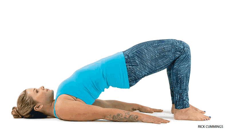 仰卧,双脚打开,与肩同宽。屈双膝,双脚尽量靠近臀部,吸气的同时推髋向上,双臂伸直向下压地,十指交扣或抓住脚踝。