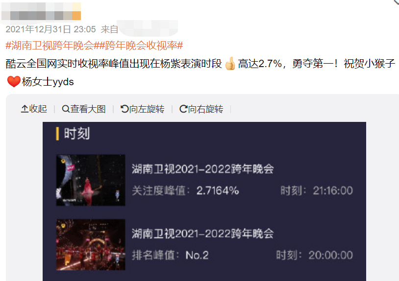 当然,比起造型出彩,杨紫出场表演的时间段,勇夺当晚实时收视率第一,这成绩更让人惊讶,国民度杠杠的啊!
