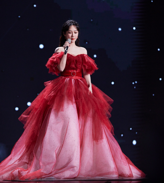 她穿着一袭酒红色的纱裙,打扮得像公主的她唱的歌曲是《温蒂公主的侍卫》,不得不说,紫妹的造型师可算开窍了。