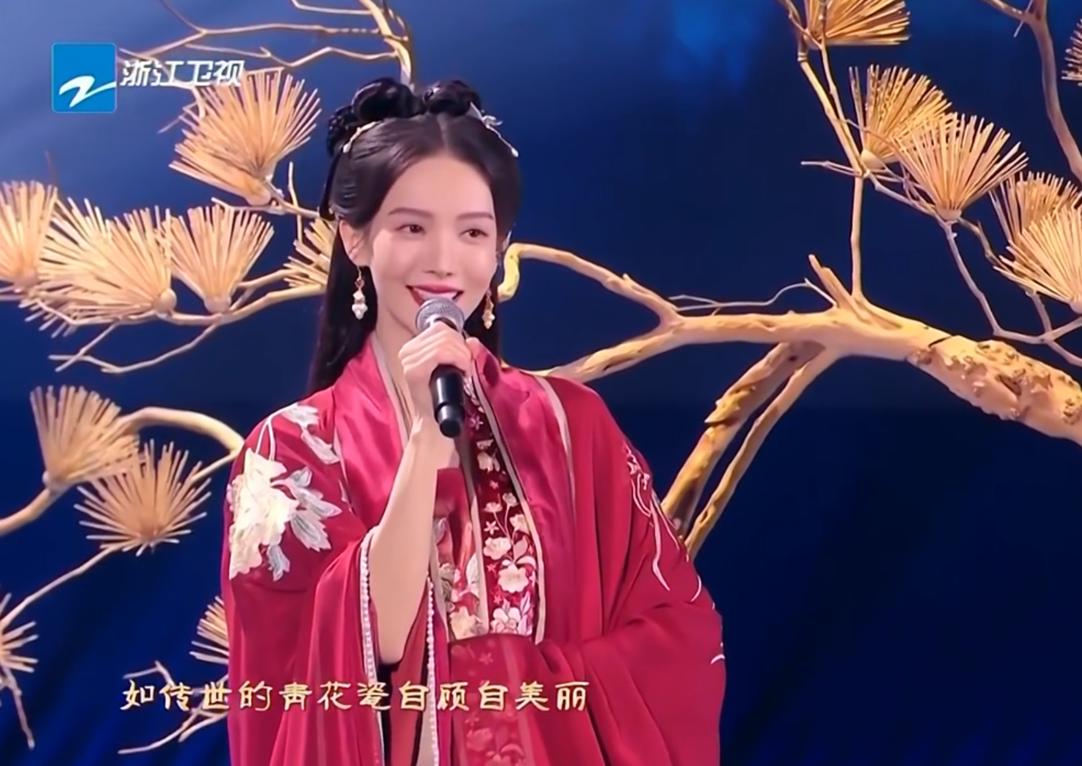 金晨也在浙江卫视,穿了一身红色古装演唱《青花瓷》,倒是别出心裁。