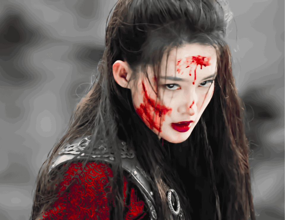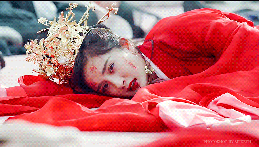 服裝上要麼是清淡的純白色系,要麼是飽滿的大紅色,要麼是暗色的戰袍,都是為了讓“戰損妝”更具反差色,畫面更唯美。底妝白皙,這樣傷口鮮血會顯得更扎眼,搭配上紅唇才更有那種驚心動魄的美感。