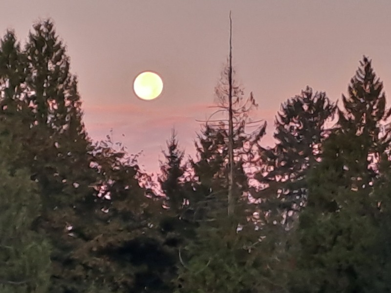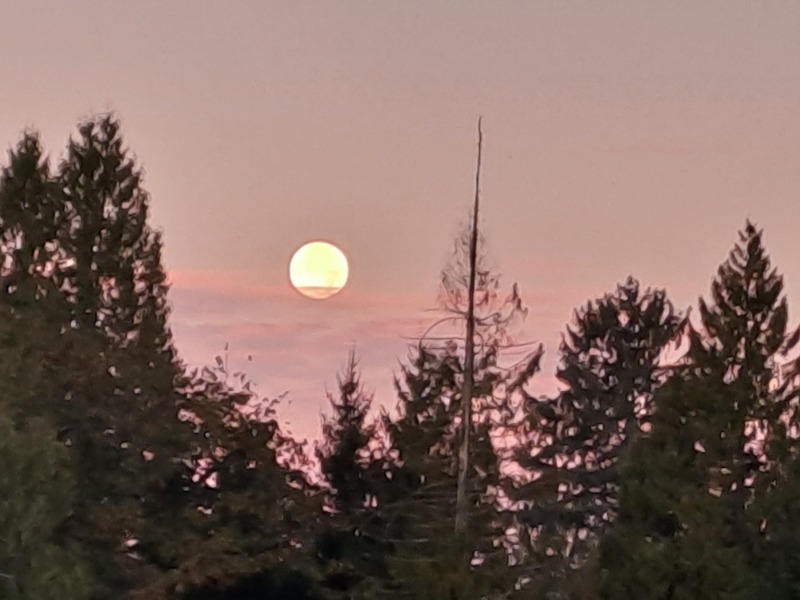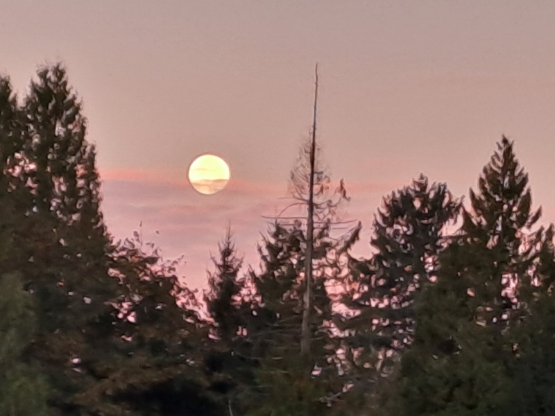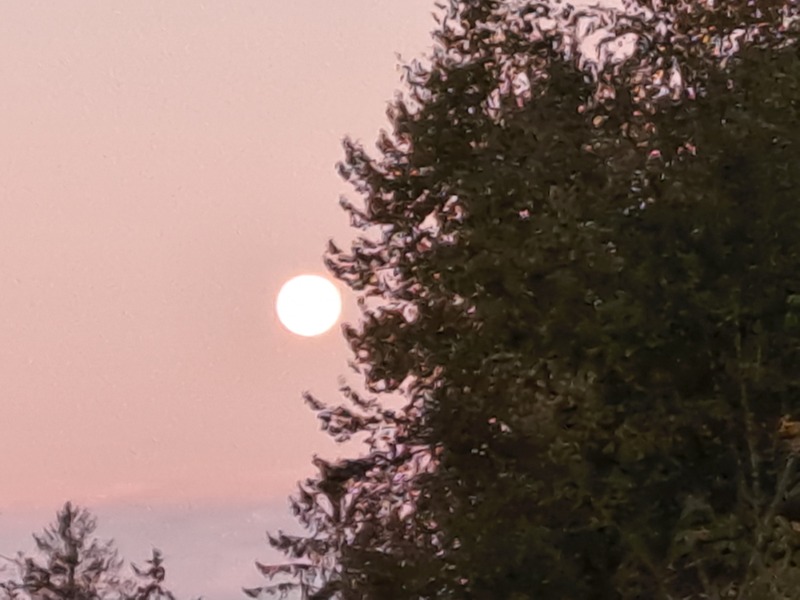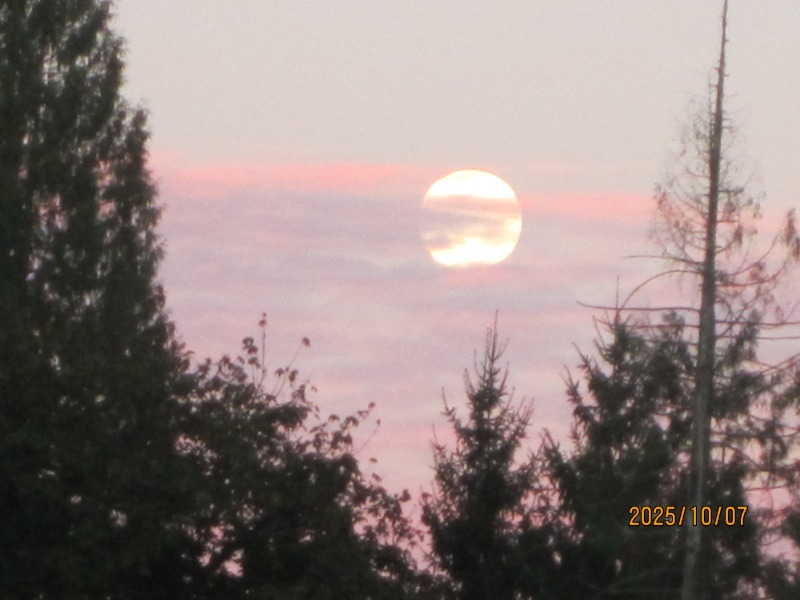 清晨,東方欲曉,中秋月懸掛在正西方的低空,月亮之下是一片火紅的彩雲飄帶,好一幅美麗的彩雲托月的妙景。彩雲緊緊纏繞在玉盤周圍,似乎不願讓玉兔離去。 。 。 。 。
