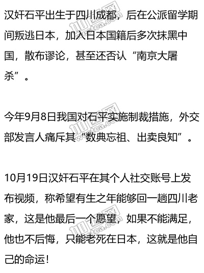 10月19日汉奸石平发布视频,称希望有生之年能够回一趟四川老家,这是他最后一个愿望!