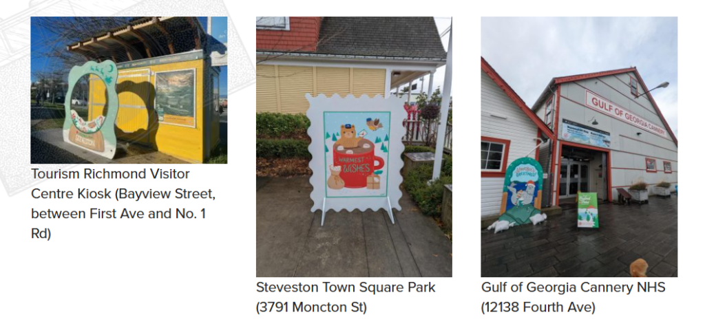 列治文旅游局游客中心亭(Tourism Richmond Visitor Centre Kiosk)、市政廣場公園(Town Square Park)和喬治亞灣罐頭廠(Gulf of Georgia Cannery)都設有免費自拍站,在這裡與家人朋友好好拍些美照吧。