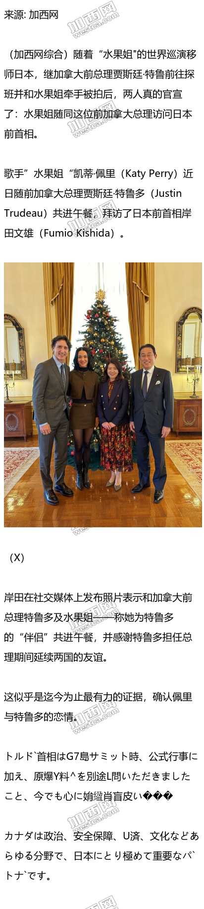 41歲的水果姐與53歲的特魯多自今年7月TMZ發布兩人同框照片以來,一直未直接確認戀情。這張岸田發布的照片為公眾提供了兩人作為情侶的清晰畫面,此前流傳的大多數照片多為夜間拍攝的模糊狗仔照,有時可見兩人公開親昵的瞬間。