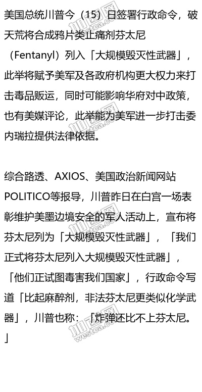 POLITICO评论,川普将芬太尼列为大规模毁灭性武器,可能对美国对中国的政策及美军在西半球的军事部署造成广泛影响。他宣布这项政策的时间点尤其引人注目,外界揣测为了进一步施压委内瑞拉犟人总统马杜洛,川普可能下令对委国境内的毒品走私目标进行地面打击,将芬太尼列为大规模毁灭性武器,将为美军对委国动武提供额外法律依据。