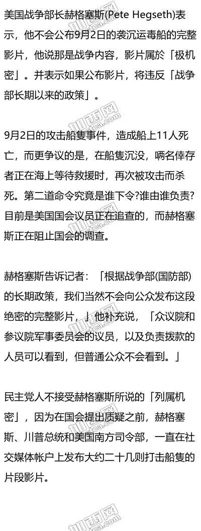 参议院少数党领袖舒默(Chuck Schumer)表示,如果保密是个问题,那么赫格塞斯可以在保密场合里,一同与每位参议员检视影片。