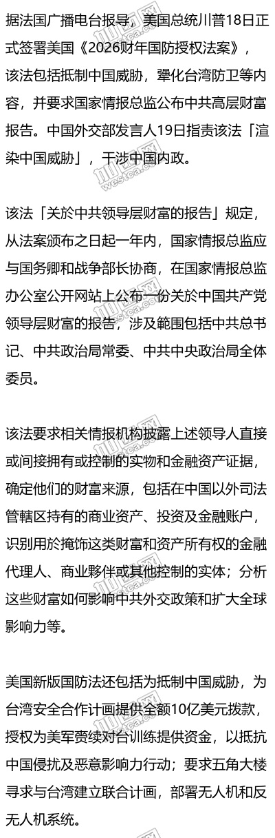 中国国台办发言人陈斌华也於19日回答记者时抨击美国2026国防授权法案「塞入涉台错误内容」,「企图进一步武装台湾」,中方坚决反对。