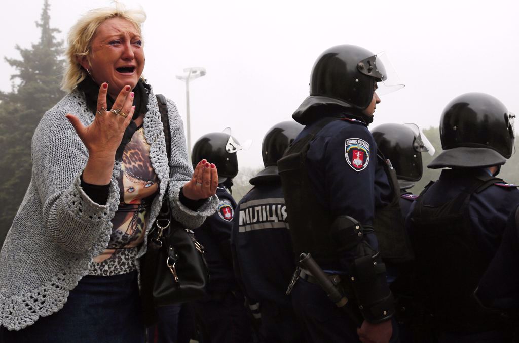 2014年5月3日,乌克兰极右派纵火工会大楼酿48死,敖德萨一名妇女在外面做出反应。