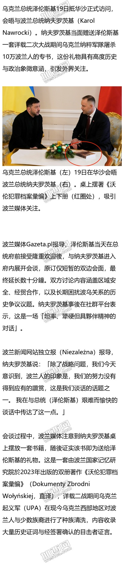 波兰总统纳夫罗茨基(Karol Nawrocki)19日与乌克兰总统泽伦斯基会晤时,赠送了一套详载二战期间乌克兰民族主义份子,於现今乌克兰西部地区对波兰人等少数族裔进行的种族清洗的专书,是为「沃伦大屠杀」(Volhynia massacres),遇害者逾10万人。普丁时常挂在嘴上的「乌克兰去纳粹化」究竟是什么?西方媒体明明声讨「乌克兰纳粹问题」十馀年,在战争打响後郄又假装不存在,所幸随战局推进,过去遭到屏蔽或者暂时隐藏下架的新闻片段,最近也都再度能在网路上搜得到了。