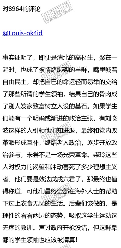 當年我在攻讀中國古代史碩士。我從頭到尾參加了當年的這場學生運動。這場學生運動的最初矛頭並不是針對鄧小平的。而是反對“官倒”,反對趙紫陽的兒子趙大軍那一幫的官倒。這些當官的子弟利用父母親手中的權利,搞批文,倒賣稀缺的物資,獲取暴利。後來趙紫陽和一批親西方人士利用宣傳工具,把反官倒變成了爭取民主。廣大學生的初衷是正確的,只是被無恥的政客利用了。當年我在天安門廣場上也是熱血沸騰,現在回想起當年的一切,才明白後面有著多少不可告人的肮臓的秘密。如果不是美國在暗中策劃一切,當年的學生領袖又何必流亡美國?王丹也應當在中國把牢底坐穿,何必逃竄到美國變成反華反共的極端分子?