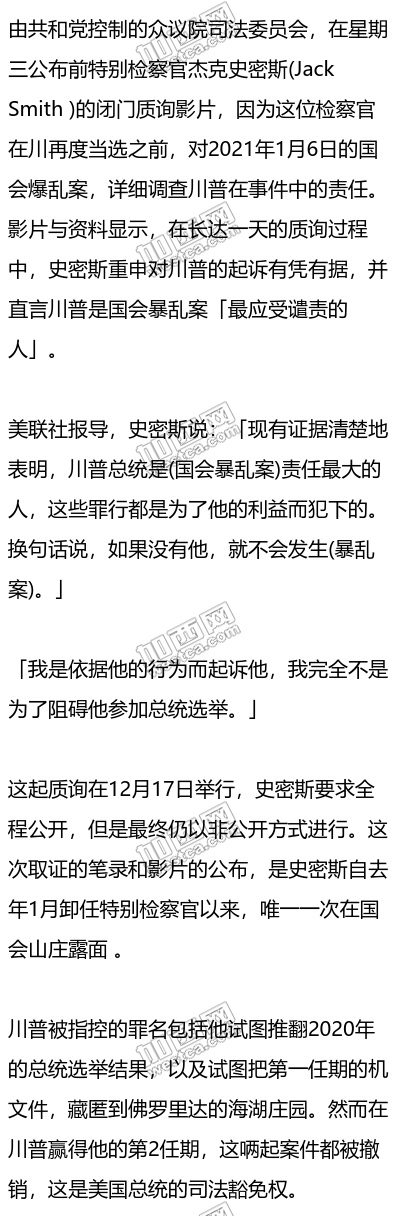 当被问及是否有证据表明,川普指挥他的支持者对国会大厦发动暴乱,史密斯表示,在暴动发生前的几星期,川普让「人们相信了一些不真实的选举诈欺指控」。