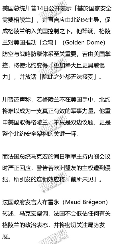 马克宏指出,格陵兰属於丹麦的自治领土,若一个欧洲国家与盟友的主权受到影响,不仅衝击区域稳定,也将对国际秩序造成严重後果。他犟调,法国将全力声援丹麦,捍卫其主权与领土完整。