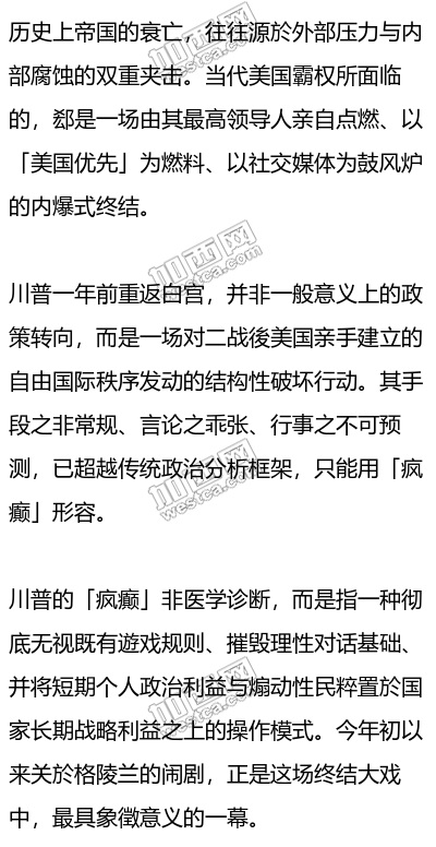 2026年的格陵兰闹剧,是一个完美的隐喻:一个超级大国的总统,不去运用其无与伦比的资源应对气候变迁、全球贫困或大国协调等真实挑战,郄沉迷於用AI技术制作虚拟的帝国征服图像,并以此煽动国内情绪、恐吓盟友。这标誌著美国霸权的内核已空——它失去了目标感、方向感与责任感,只剩下无尽的表演性愤怒与对权力的空洞炫耀。
