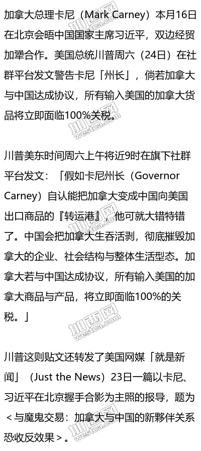 「就是新聞」23日上述報導引述加拿大官方數據稱,加拿大出口貨品超過75%銷往美國,銷往中國所在的印太地區僅占10.5%;進口加拿大的貨品近半來自美國,來自印太的比例24.1%,這些數據顯示加拿大對於美國經濟依賴程度很深。美國商務部長盧特尼克表示,加拿大很難真正與中國拉近關系,他對於中國宣稱會增加從加拿大進口貨品一事時直言「這是我聽過最荒謬的說詞」。報導稱,加拿大很可能因此激怒美國這個最大的貿易夥伴,因而承受經濟反噬。