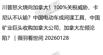 川普怒火烧向加拿大!100%关税威胁,卡尼认不认输?中国电动车成间谍工具,中国矿业巨头收购加拿大公司,加拿大左倾沦陷?