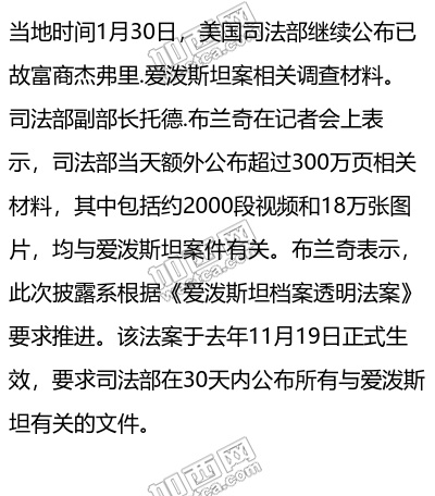 美國司法部繼續公布300萬頁已故富商傑弗裡.愛潑斯坦案相關調查材料