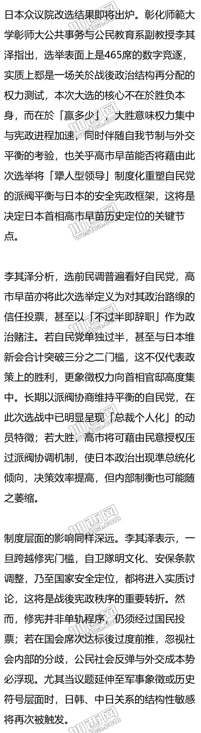 但另一種情境亦不可排除。李其澤指出,若自民黨僅小幅過半,或未達修憲三分之二門檻,意味選民支持執政延續,卻未給予制度改造的空白授權。在此情況下,高市將被迫回到協商型治理軌道,維新會的議價能力上升,黨內溫和派重新取得空間,修憲議程也將隨之放緩。權力重新分散於國會結構之中,政治節奏轉為審慎。
