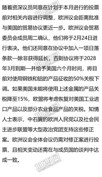 欧洲议会距离批准与美国的贸易协议更近一步