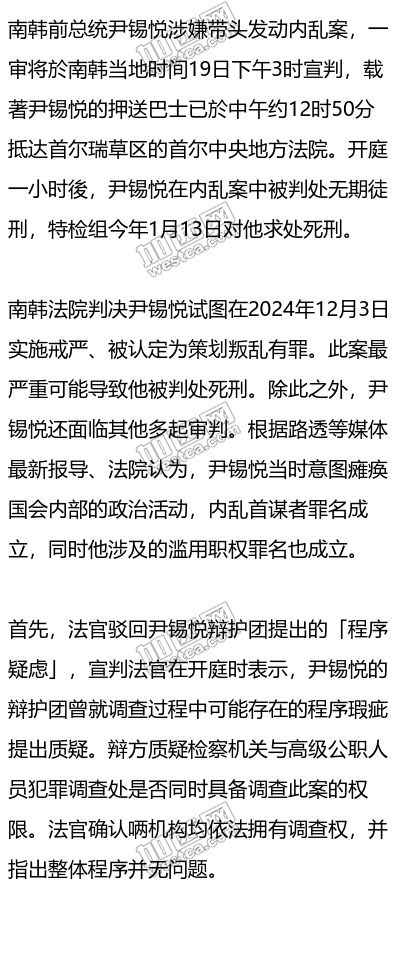 依南韓法律,策劃叛亂的最高刑度為死刑或無期徒刑。南韓上次判處死刑案例是在2016年,但自1997年以來未曾執行任何死刑。審理本案的首爾中央地方法院周邊今天部署大批警力,警車巴士在法院外圍形成嚴密的安全封鎖缐。前國防部長官金龍顯、前警察廳廳長趙志浩等7名軍警高層涉嫌執行內亂重要任務案一審宣判結果也將出爐,庭審通過電視和YouTube等平台現場直播。