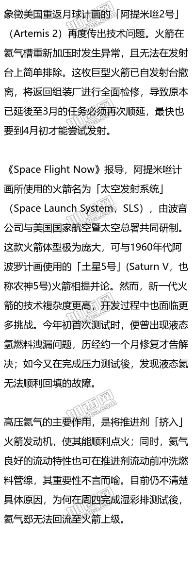 NASA 局长艾萨克曼(Jared Isaacman)在 X 平台发文表示:「无论潜在的故障原因为何,相关检修与修复作业都必须在组装大楼(VAB)内进行。我们将开始将火箭送回,这也意味著3月的发射窗口已被排除。」