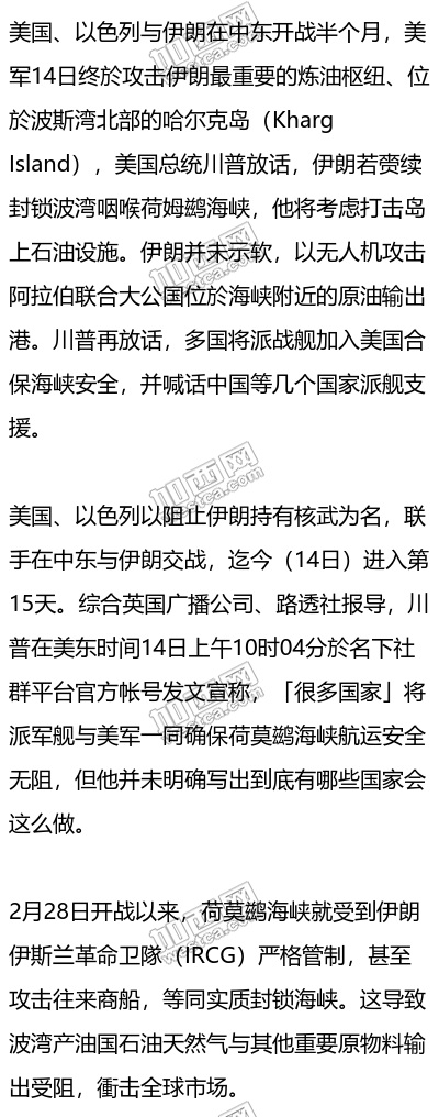 川普写道:「很多国家,尤其是因伊朗设法封锁荷莫鹚海峡受影响的国家将派出战舰,与美国联手确保海峡畅通与安全。我们已彻底摧毁了伊朗100%的军事能力,但即使他们败得多么惨重,仍可轻而易举派出一唡架无人机、布设水雷、在荷莫鹚海峡沿岸或海峡内发射短程弹道飞弹。」