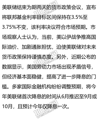 宣布将联邦基金利率目标区间保持在3.5%至3.75%不变