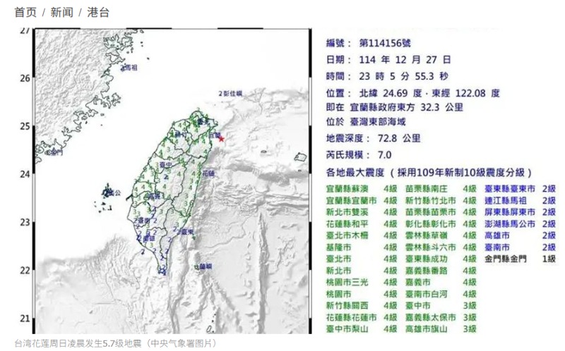 凌晨1点14分发生芮氏规模 5.7级 地震,
