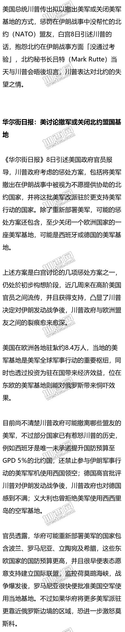 川普已多次表达对北约盟友的不满,并扬言退出北约,半岛电视台、美联社报导,白宫新闻秘书李威特(Karoline Leavitt)8日在记者会上公布一段川普对北约在伊朗战事上的评价,「他们被测试,但没通过考验」,「遗憾的是,过去6周北约背弃了美国人民,这段时间美国人民仍持续资助他们的防禦」,川普也预告,当天下午将与北约秘书长吕特进行「非常坦诚的对话」。