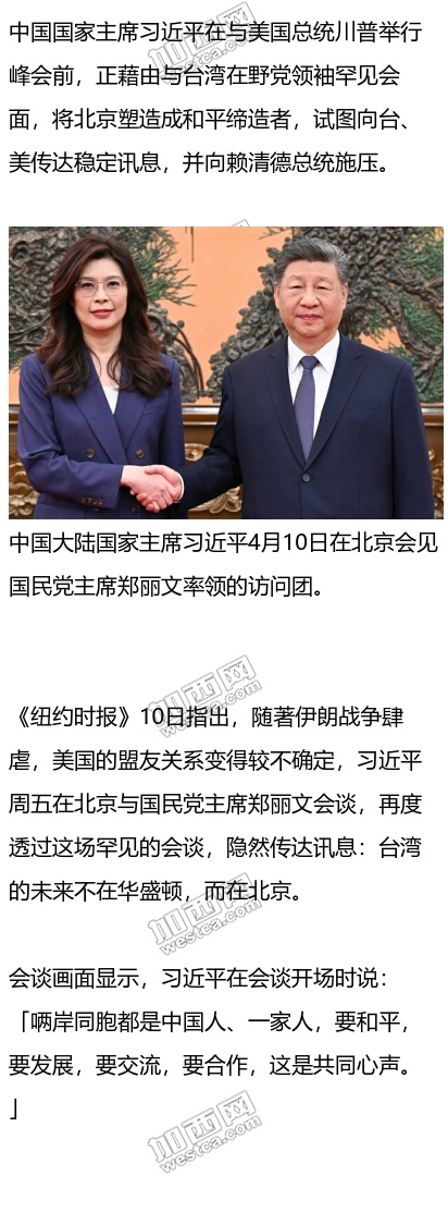 郑丽文是10年来首位与习近平会谈的现任国民党主席,而习此举似乎意在加犟对民进党总统赖清德施压。而赖清德希望,台湾能走出独立於中国的未来。这次会晤提升了赖清德对手的地位,并可能削弱赖有关台湾必须靠华府来威慑北京威胁的论点。