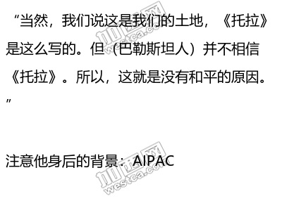 他滿嘴都是AIPAC的錢味在往外流!基本意思就是:如果你不相信《托拉》,就滾出巴勒斯坦?順便說一句,穆斯林其實是相信《托拉》和《聖經》的