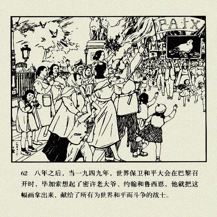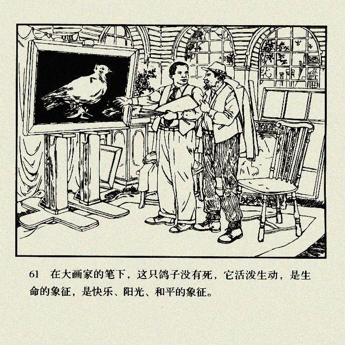 欣然挥笔画了一只衔着橄榄枝的飞鸽。当时智利的著名诗人聂鲁达把它叫做"和平鸽",由此,鸽子才被正式公认为和平的象征。