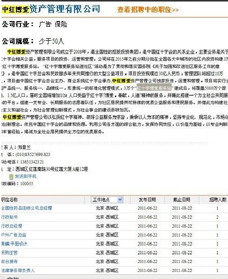- 時間: 2013-4-29 14:20在2008年8月這個合資公司項目突然被取消了,與此同時(2008年6月20日),一間叫做“中紅博愛資產管理有限公司”注冊成立,獨家“投資、運營、管理”“紅十字博愛服務站”(以下截圖是該公司的招聘廣告和工商信息)