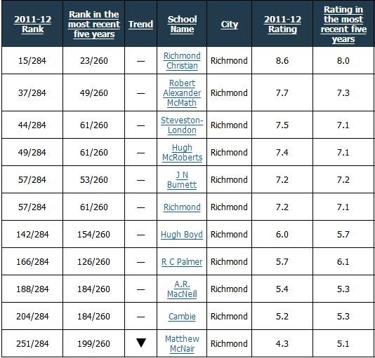 我们华人买房是非常重视学区的,如果一定把学区做个比较的话,我们就参考fraser institute 的排名来看一下,列治文有5所公立中学位于全省的前50名左右,一所私立中学更是名列前茅。