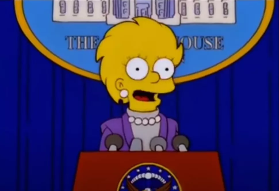 假若賀錦麗真的爭取到民主黨支持,並在11月美國總統大選中擊敗川普,那麼她將實現《辛普森家庭》之中麗莎當上總統的畫面。
