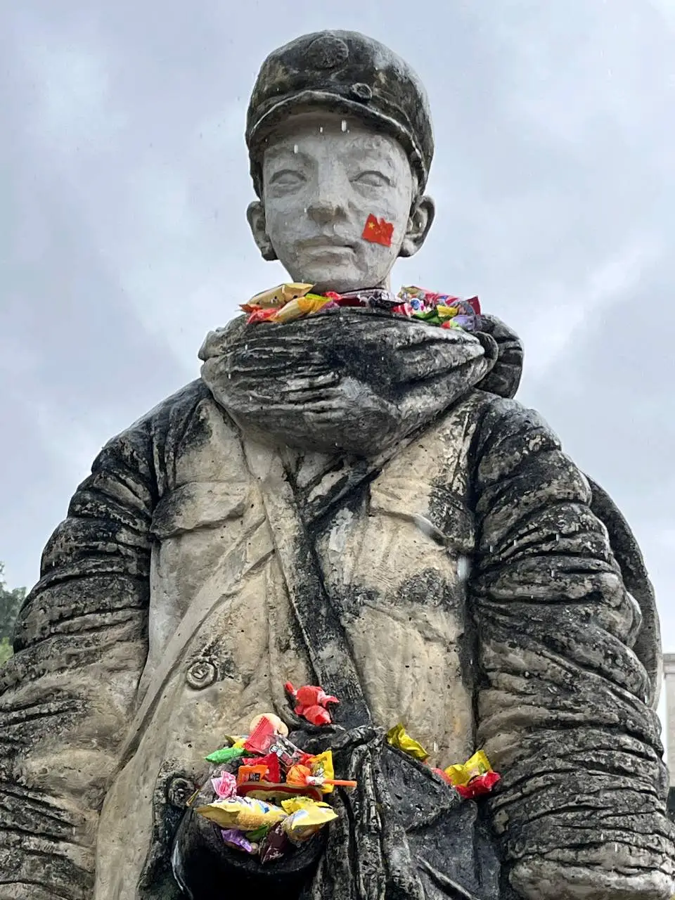 最让人无法收敛情感的,还是娃娃兵方阵,瞻拜者们在雕塑的脖领处,腰间的搪瓷缸里,书包里,塞满了糖果,他们脚下,也堆满了祭品。