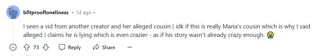 我看過另一個創作者和她所謂的堂兄(不知道這是不是瑪麗亞的堂兄,所以我才說所謂的堂兄)的視頻,聲稱他在撒謊,這更瘋狂了——好像他的故事還不夠炸裂似的。