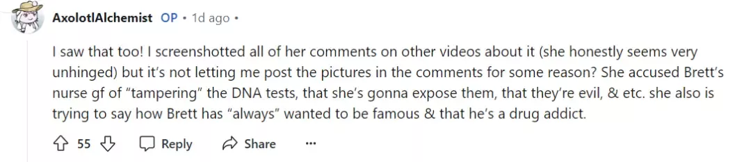 我也看到了!我截屏了她對其他視頻的所有評論(老實說,她看起來非常精神錯亂),但出於某種原因,它不讓我在評論中發布照片?她指責布雷特的護士女友“篡改”了DNA測試,她要揭露他們,還說他們是邪惡的,等等。她還試圖說布雷特“一直”想出名,而且還是個癮君子。