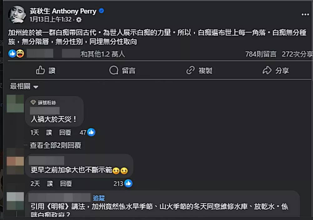金馬影帝黃秋生在臉書開炮:“加州終於被一群白癡帶回古代。為世人展示白癡的力量。所以,白癡遍布世上每一角落。白癡無分種族,無分階層,無分性別,同埋無分性取向。”他認為這一次加州大火的原因,人禍大於天災。