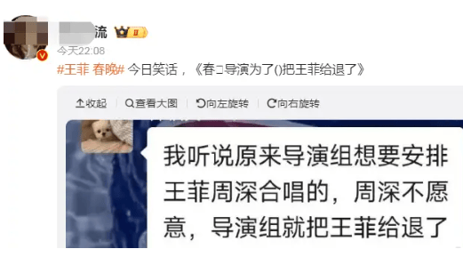 然而,21日晚,有网友爆料称王菲被导演组劝退,原计划与周深合唱,但周深未同意。周深作为当红歌手,与王菲的合作本应是亮点,但这一爆料让春晚节目安排成谜。