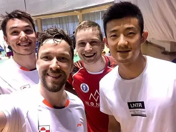 ·尼尔森(右二)参加国际比赛时,与中国羽毛球奥运冠军谌龙(右一)合影。