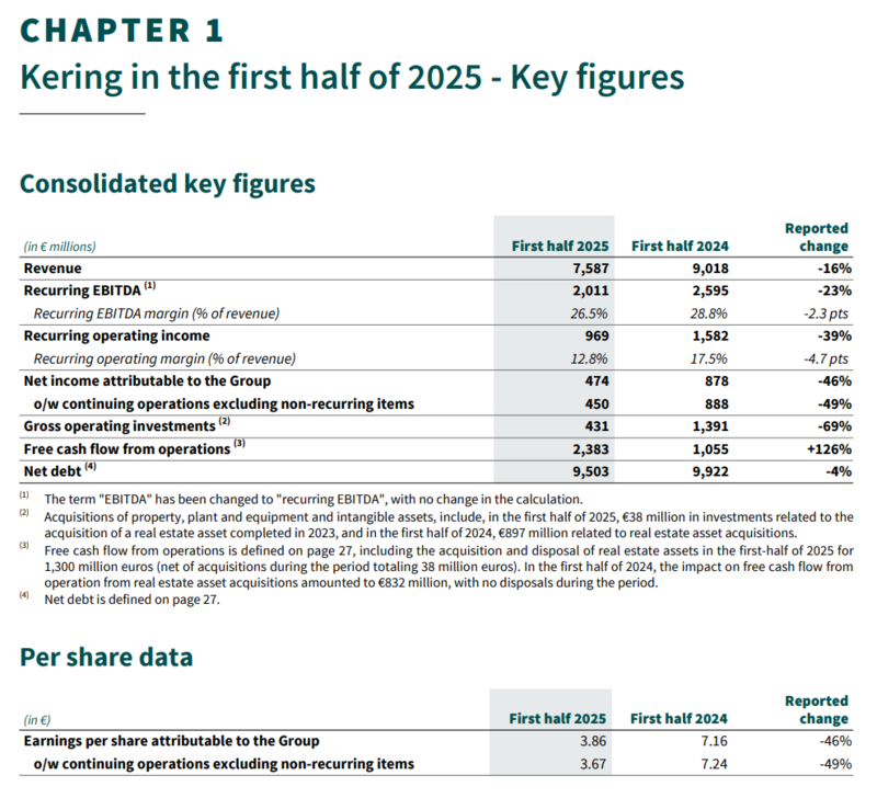 財報數據顯示,開雲集團2025年上半年營業收入約為76億歐元,同比下降16%;經常性營業利潤約為9.69億歐元,同比下降39%;淨利潤為4.74億歐元,同比下降46%。