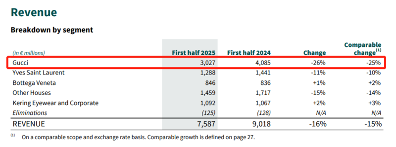 集團核心品牌古馳(Gucci)表現持續低迷,上半年營收約為30.27億歐元,同比下降超25%;第二季度營收約為14.56億歐元,同比降幅超25%。
