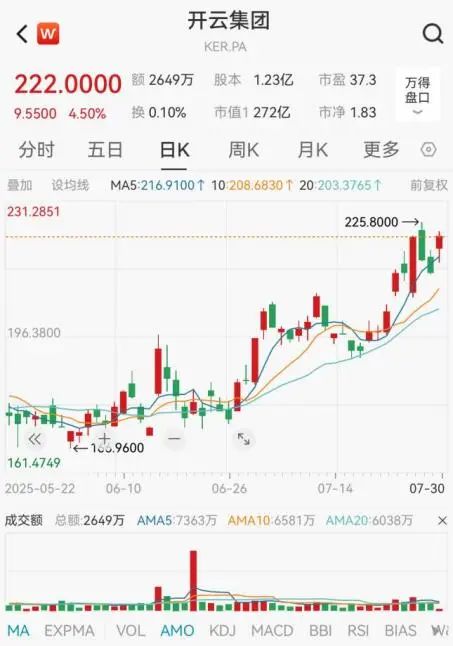 截至記者發稿,開雲集團股票報222歐元/股,單日漲幅為4.5%。